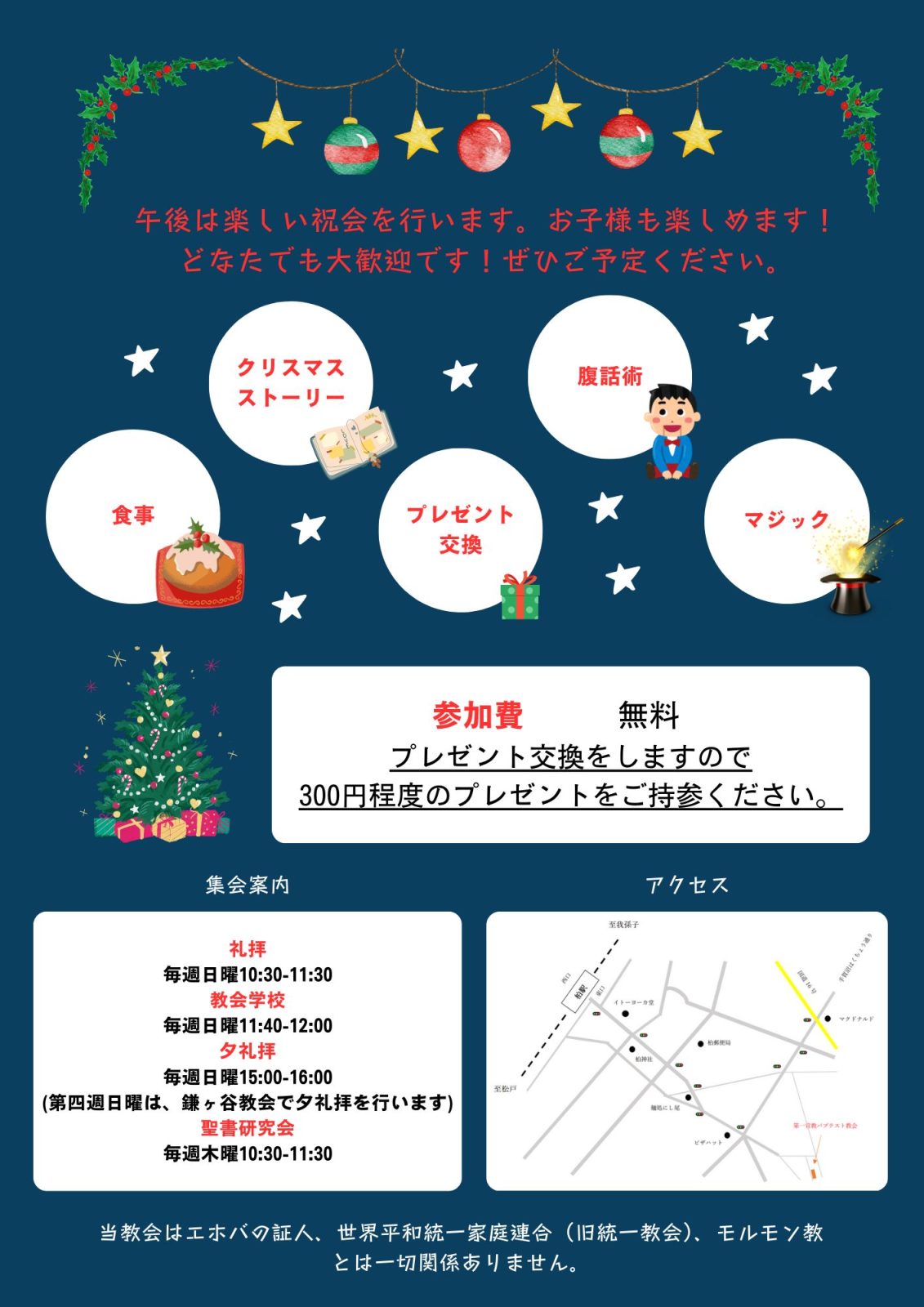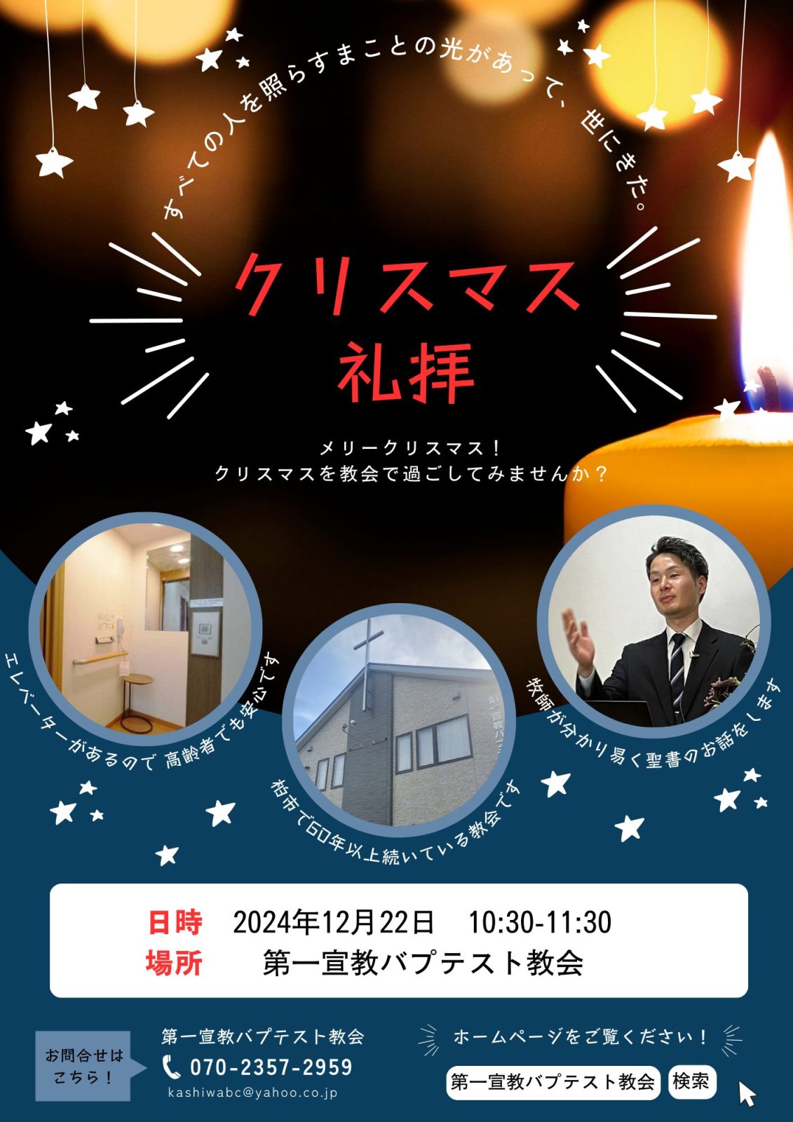 クリスマス礼拝のお知らせ! 2024 11/28 お知らせ 今年もクリスマスの時期がやってまいりました。 教会では12月22日(日)にクリスマス礼拝を行います。 午後には祝会も予定しています。参加費は無料で、どなたでもご参加いただけます。 ぜひご参加下さい! お知らせ 婦人研修会やります 結婚しました! 関連記事 隣保館にクリスマス慰問をしました! 2024年12月7日 結婚しました! 2024年11月28日 婦人研修会やります 2024年9月16日 合同賛美集会やります! 2024年9月11日 成人キャンプ開催しました 2024年9月5日 日曜学校キャンプを開催しました 2024年9月5日 按手礼式(牧師就任式) 2024年7月22日 2024年8月19~21日 日曜学校キャンプを行います 2024年7月3日